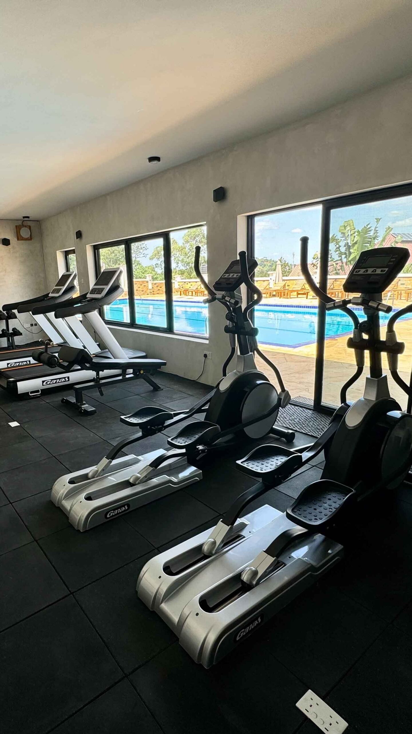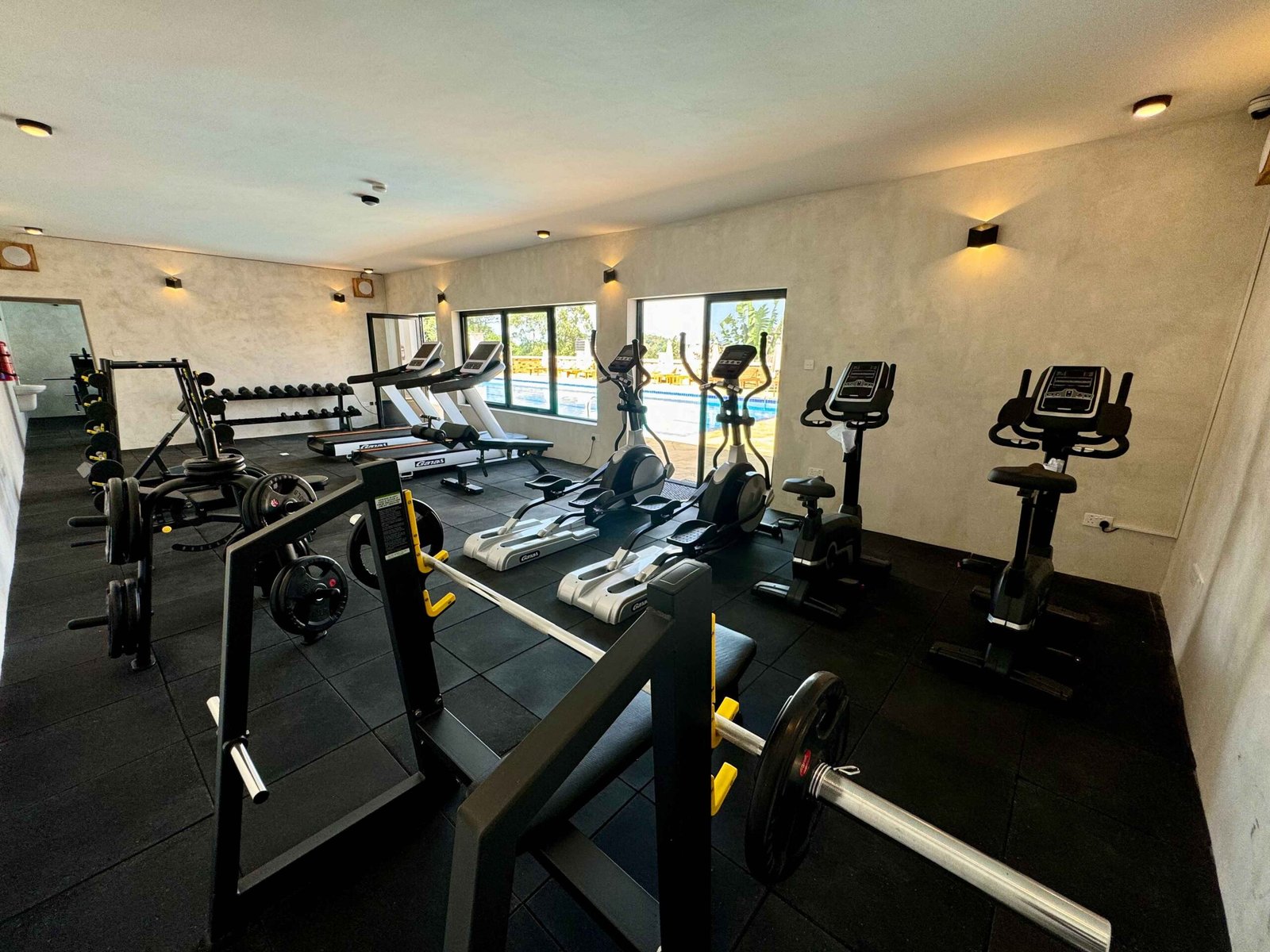 In addition to a wide selection of weightlifting equipment, you find 2 treadmills, 2 cross trainers and 2 exercise bikes, from where you can view the swimming pool areas outside.